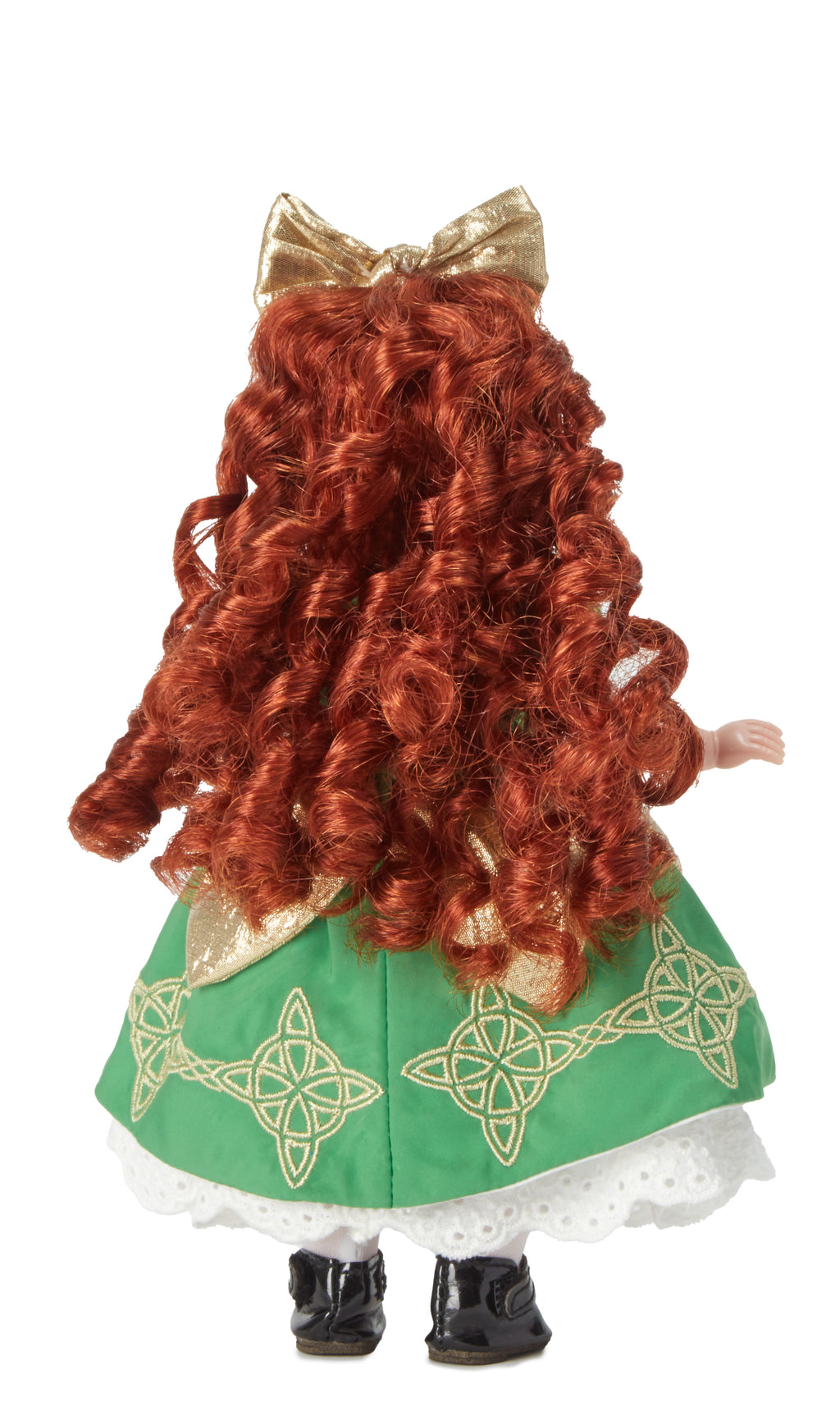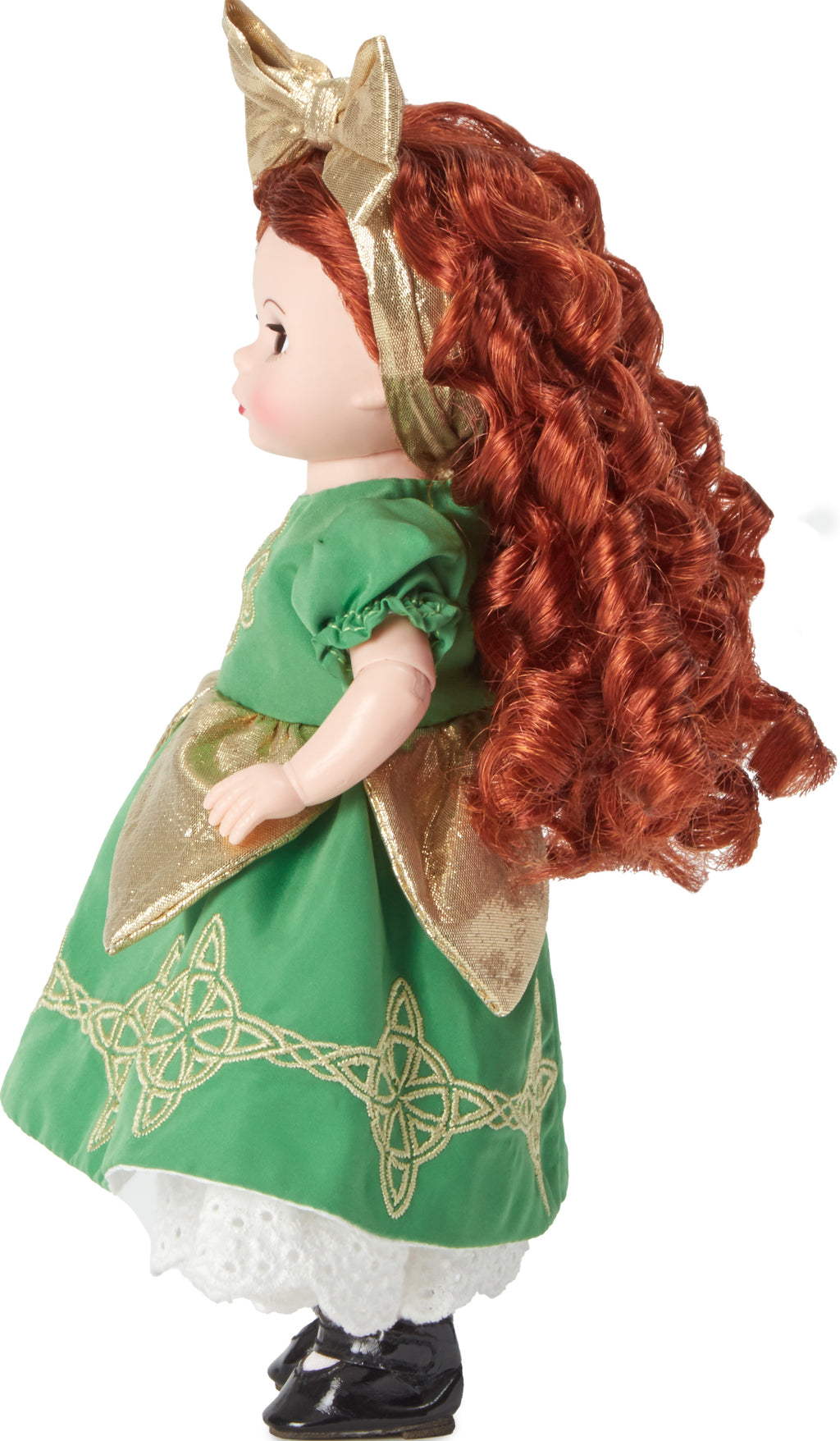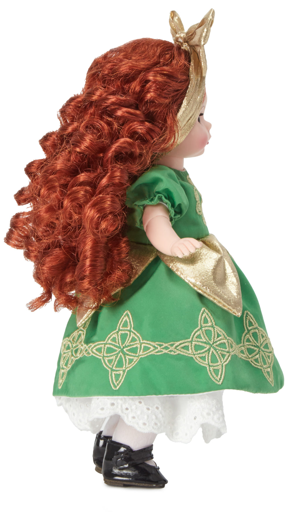 This red-headed beauty brings the luck of the Irish. This 8-inch collectible doll is dressed in a green dress embroidered with gold Celtic symbols and gold apron. Her flowing, curly red hair is topped with a gold bow. She has light skin and brown eyes. The Lucky Irish Lass doll is a classic Wendy doll with an articulated body. Recommended for ages 14+.